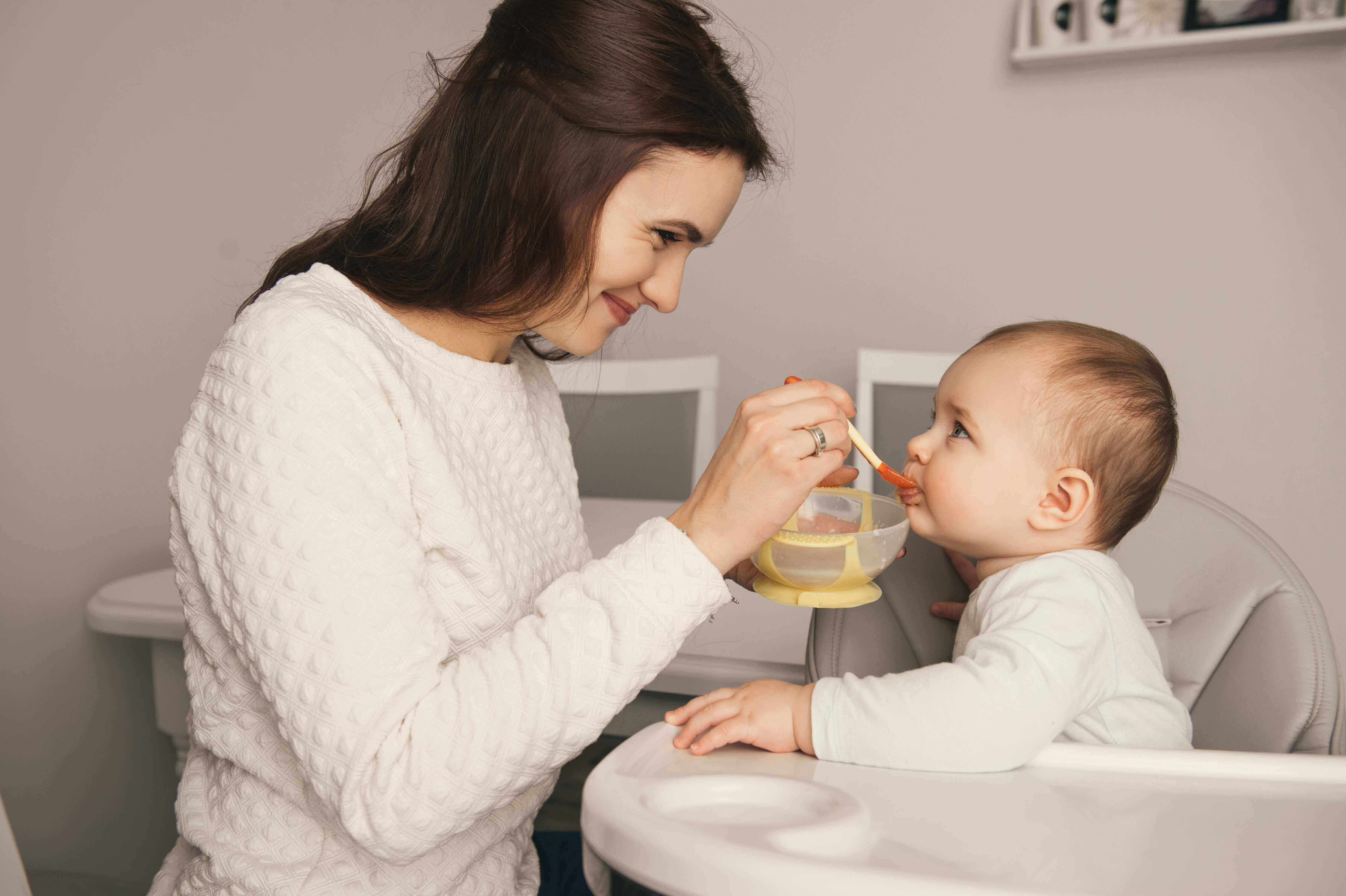 When your baby becomes comfortable with the idea of “food,” give them baby-safe utensils (such as a spoon) for practice.