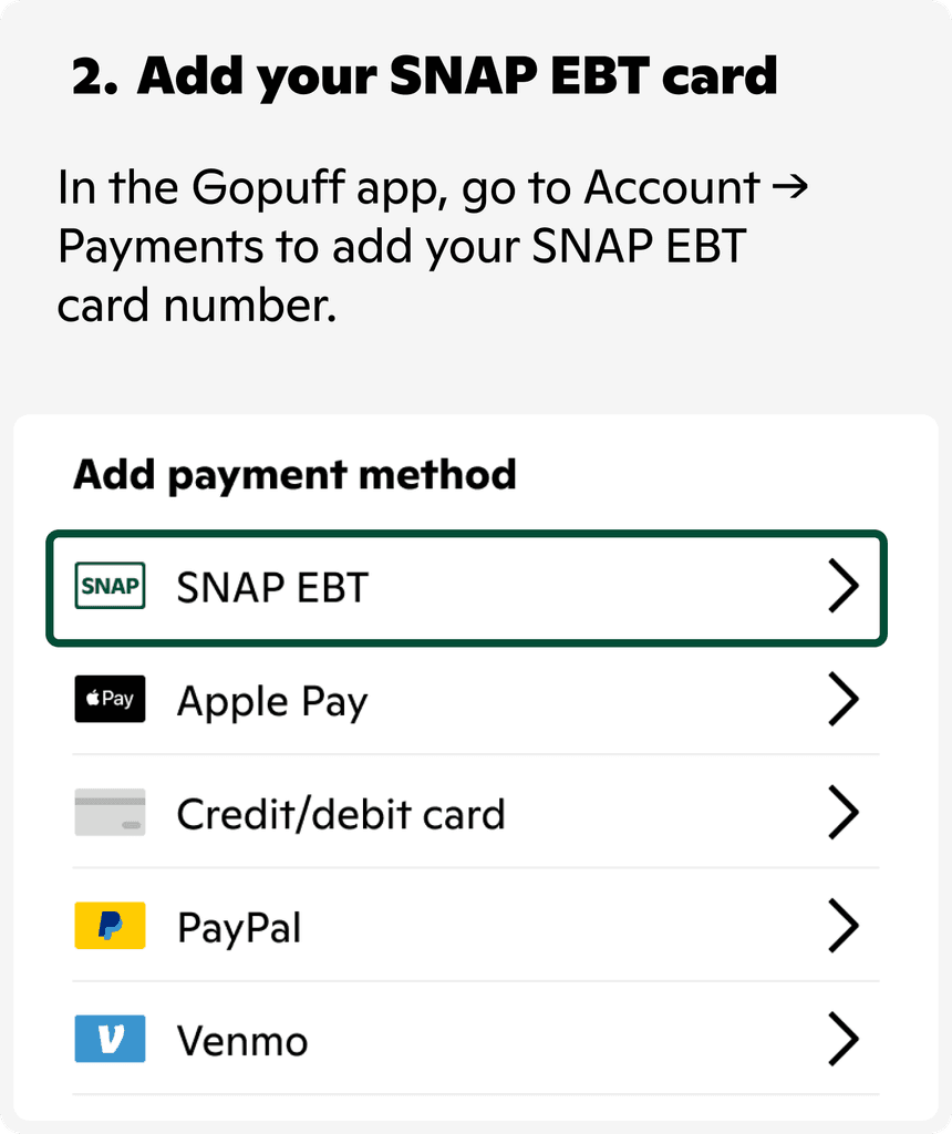 *SNAP Free Delivery Offer valid on your orders of $35 or more containing at least one EBT SNAP-eligible item and purchased using a valid EBT card through Gopuff, while supplies last. Service fees, special handling fees, regulated product fees, other fees, and/or taxes may still apply. To take advantage of this offer, customers must have a valid account on Gopuff with a valid EBT card on file. EBT cards may only be used to purchase EBT-eligible items. A non-EBT payment method (credit card, debit card, Apple Pay, Google Pay, Venmo or Paypal) must also be linked to the Gopuff account to cover fees, taxes, delivery fees and any non-EBT eligible items, if any. Gopuff reserves the right to modify or cancel this offer at any time. Only one offer per household. Offer may not be sold, copied, modified, transferred or used retroactively for prior purchases. Offer has no cash value. Void where restricted or prohibited by law. Gopuff may not be available in all zip or post codes.